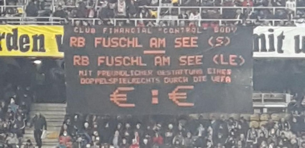 Augenauswischerei, denken Kritiker. Einer von ihnen verirrte sich offenbar am Donnerstagabend ins Salzburger Stadion. Wie weiter oben im Artikel zu sehen ist, wurde ein Protest-Plakat ausgerollt und zur Schau gestellt. RB Fuschl am See (S) gegen RB Fuschl am See (LE) ist darauf zu lesen. "Mit freundlicher Gestattung eines Doppelspielrechts durch die UEFA, €:€".