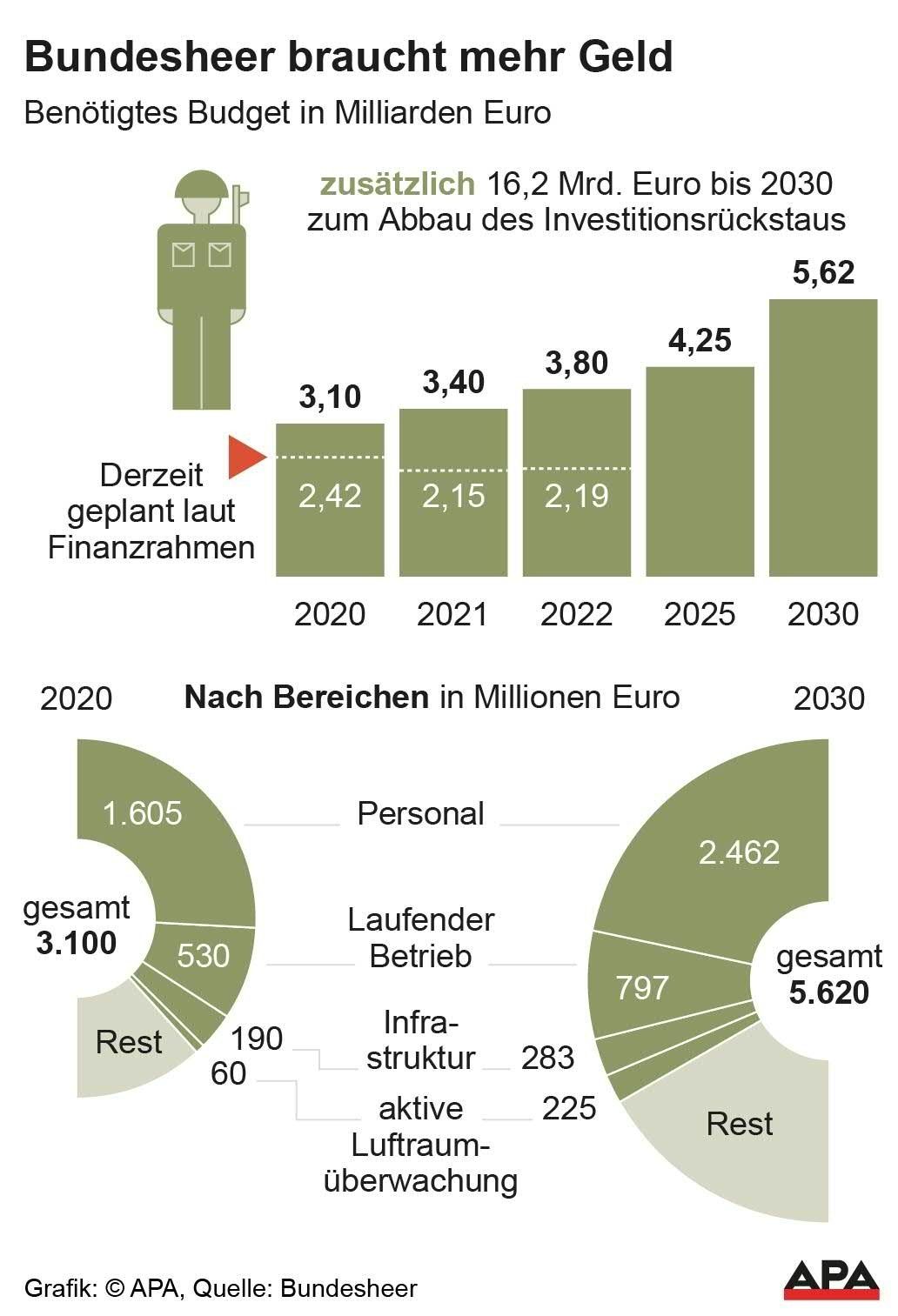 Allein der Investitionsbedarf beim Heer beträgt laut Verteidigungsminister 16,2 Milliarden Euro. Zusätzlich sei jährlich ein höheres Budget notwendig.
