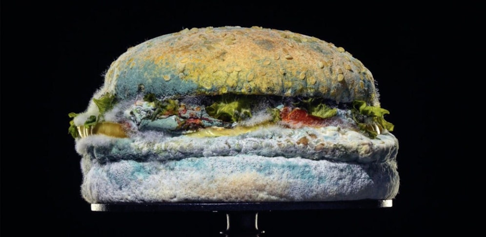 Der Slogan der Schimmel-Whopper-Kampagne beschreibt die hochauflösenden Bilder verrottender Lebensmittel sogar als "Die Schönheit ohne künstliche Konservierungsstoffe".