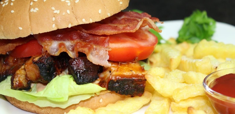 7. Die Burger Buns auf der Innenseite anrösten, den Speck kross braten und den Burger mit Salat, Tomate, Speck, Burnt Ends und Soße (nach Wahl) belegen.