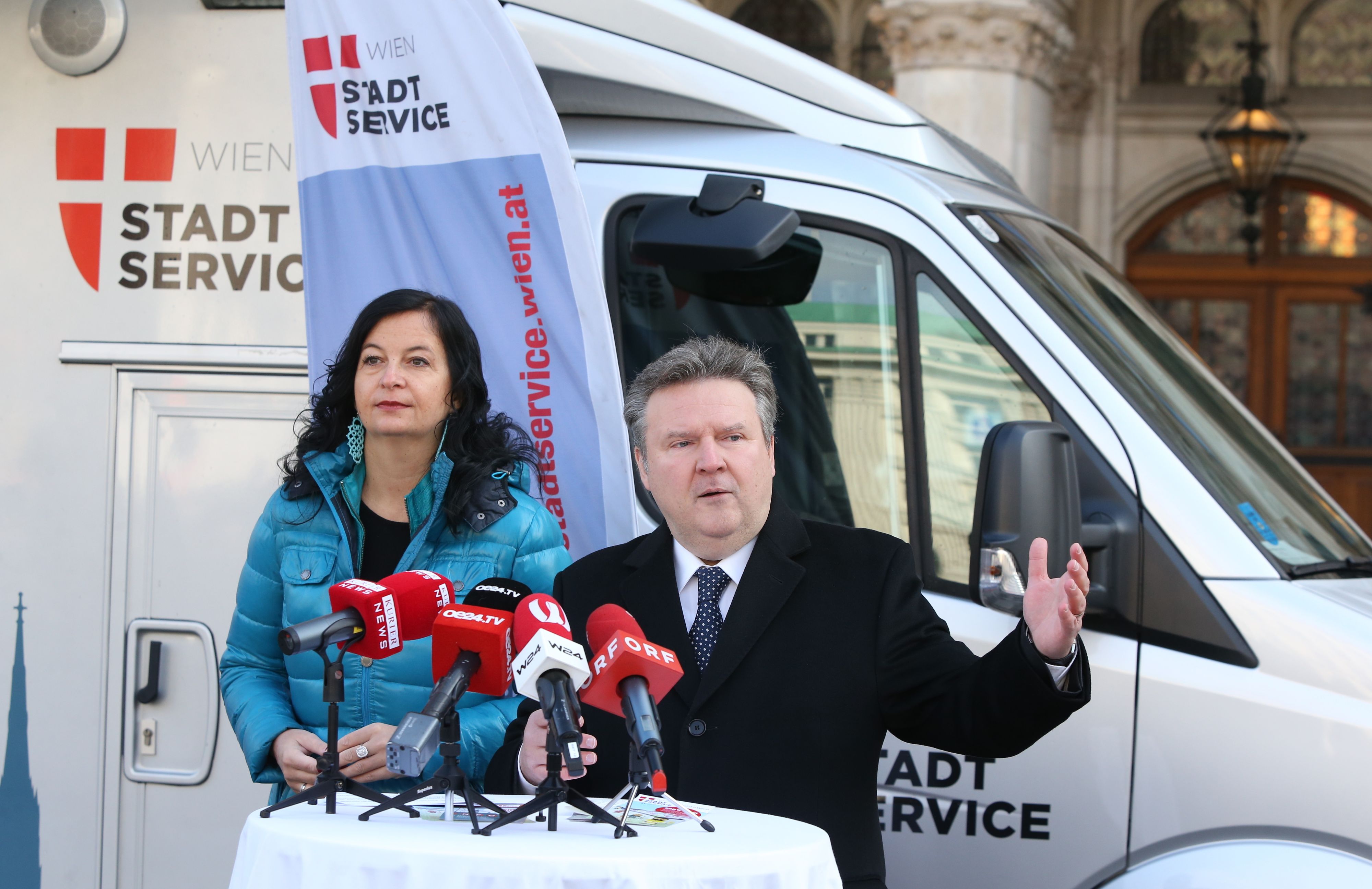 In keiner anderen Stadt gebe es einen ähnlichen Service, betonte der Bürgermeister vor einem der Einsatzwägen gemeinsam mit der für das Stadtservice zuständige Umweltstadträtin Ulli Sima (SP). Ludwig erinnerte die anwesenden Journalisten an einen Fall aus seiner Zeit als Wohnbaustadtrat: