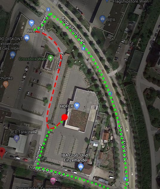 Seit November soll die Eigentümergruppe der beiden Geschäftsflächen links und rechts des Schichtwegs ein Durchfahrtsverbot eingeführt und ein Abschleppunternehmen mit der Überwachung der Zone beauftragt haben. Die Folge: Ein direktes Anfahren ist mehr möglich, stattdessen müssen die Einkäufer den langen Umfahrtsweg über Donaufelder Straße und Angyalföldstraße nehmen (siehe Grafik).
