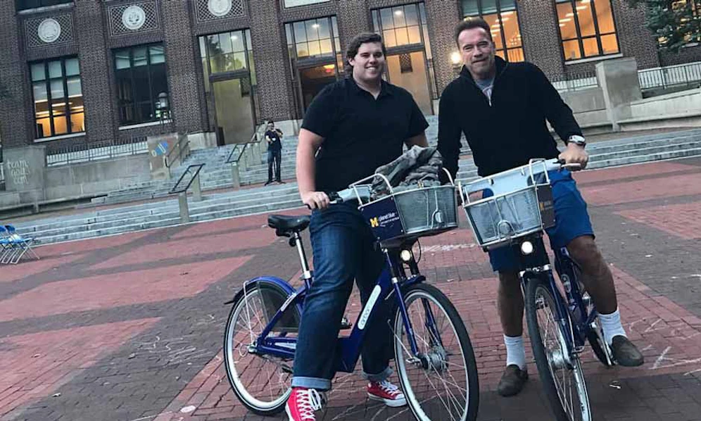 Ja, mir san mit’m Radl da … Während Arnold Schwarzenegger (69) mit seinem Anti- Trump-Tweet für helle Aufregung sorgt (siehe "Welt"), schlägt der "Terminator" bei einem Rad-Streifzug mit Sohn Christopher (19) über den Campus der Universität von Michigan leisere Töne an: "Sie sollten dich als Tour-Guide anstellen. Ich liebe dich."