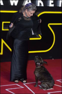 Die französische Bulldogge der verstorbenen Schauspielerin ist mittlerweile ein richtiger Star im Internet. Kürzlich sah er sich den neuen Star Wars-Trailer mit Mama Carrie an.