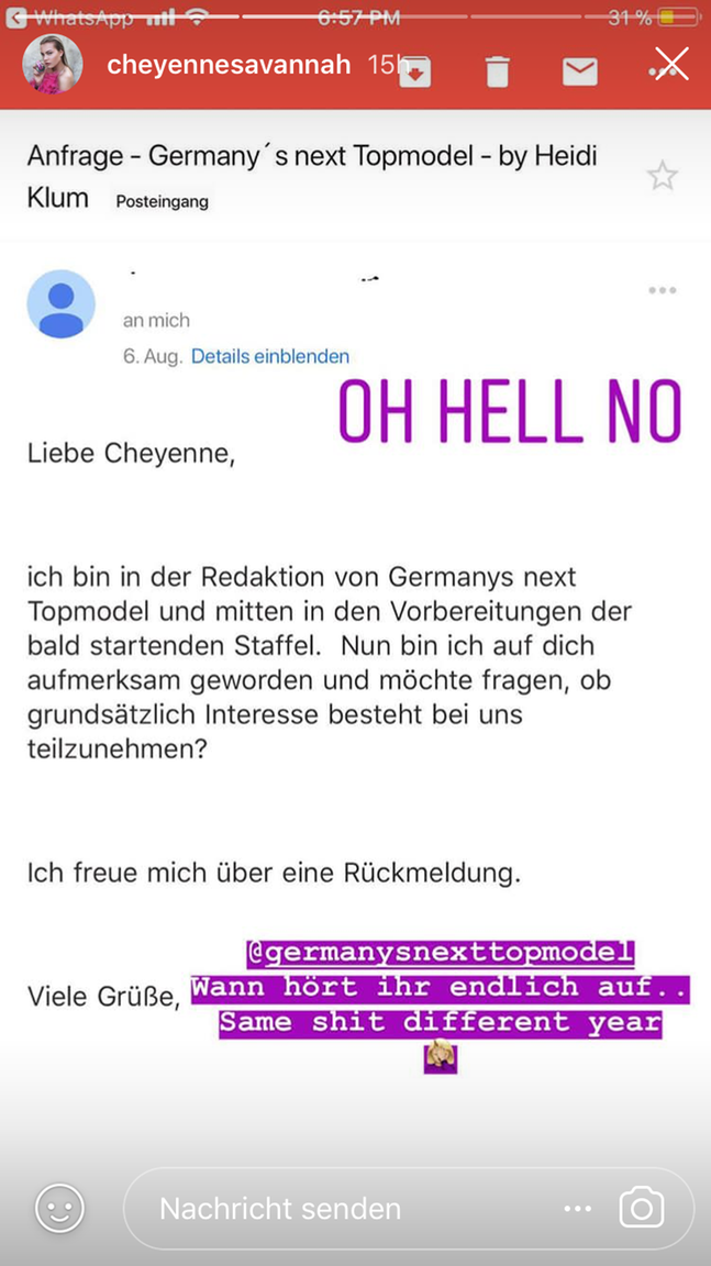 Nun trudelte bei Cheyenne eine Einladung zu GNTM ein. Es dürfte nicht die erste sein. Wenig elegant, dafür umso öffentlichkeitswirksamer gibt Cheyenne Heidi einen Korb. Es ist eine Watsche per Instagram, die sich gewaschen hat. Statt eines "Nein danke" plärrt die 18-Jährige hinaus, was sie von Klum und ihrer Show hält. "Oh Hell no", findet Cheyenne und brüskiert Heidi.
