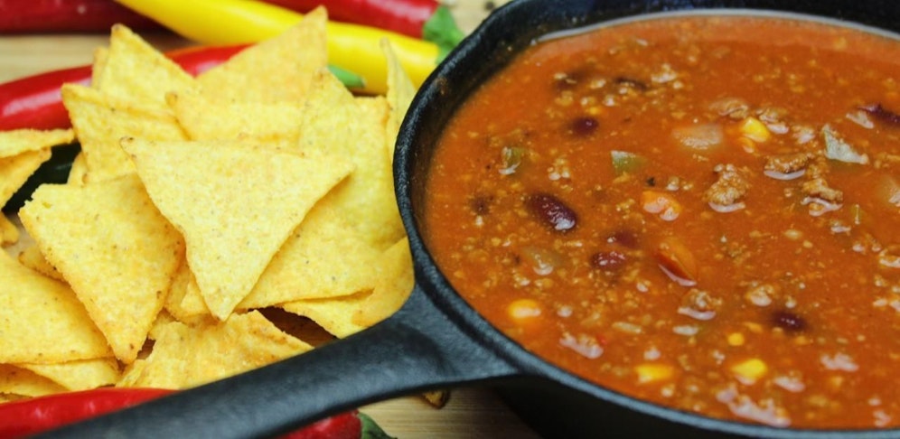 4. Chili con Carne servieren: Chili con Carne auf einem Teller mit Tortilla-Chips, Baguette oder Brot, Guacamole und saurer Sahne servieren. Mit etwas Käse bestreuen.