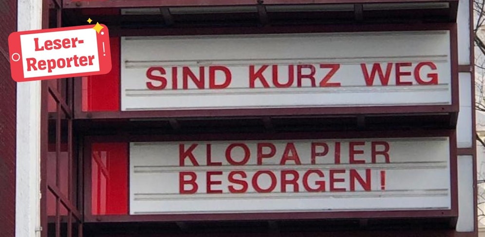 "Cine Center geschlossen. Sind kurz weg, Klopapier besorgen!", steht mit großen Lettern auf der Anzeigetafel des Gebäudes. Zumindest sorgt dieser Anblick für ein Schmunzeln bei vorbeigehenden Passanten.