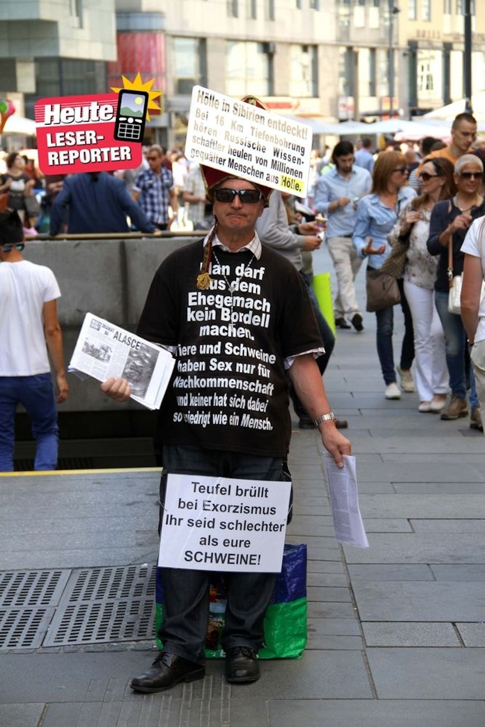 Mit Schildern bewaffnet auf denen Botschaften wie "Man darf aus dem Ehegemach kein Bordell machen" und "Tiere und Schweine haben Sex nur für Nachkommenschaft und keiner hat sich dabei so erniedrigt wie der Mensch" stehen, wirbt der Mann für seine Anliegen.