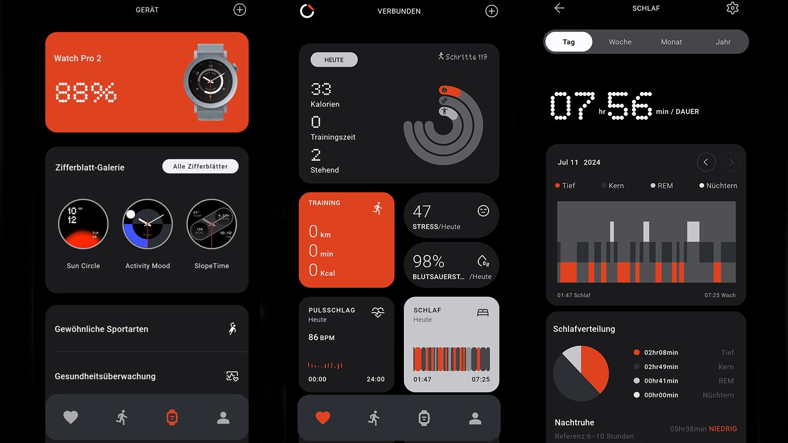 Ebenso darf man keine Apps selbst installieren – die Uhr läuft nämlich auf einem Nothing-eigenen Betriebssystem und wird mit der "CMF Watch"-App am Smartphone kontrolliert. Unterstützt werden aber nicht nur Nothing-Handys, sondern auch Apple iPhones ab iOS 13 und Android-Handys ab Version 8.0. Die Kopplung per Bluetooth funktioniert einfach und schnell über die App, anlegen muss man sich allerdings einen Nothing-Account. Für die optimale Nutzung wird dabei Geschlecht, Geburtstag, Größe und Gewicht angegeben. Die Watch selbst wird über den Touchscreen, aber auch die dreh- und drückbare Krone am Gehäuse gesteuert.
