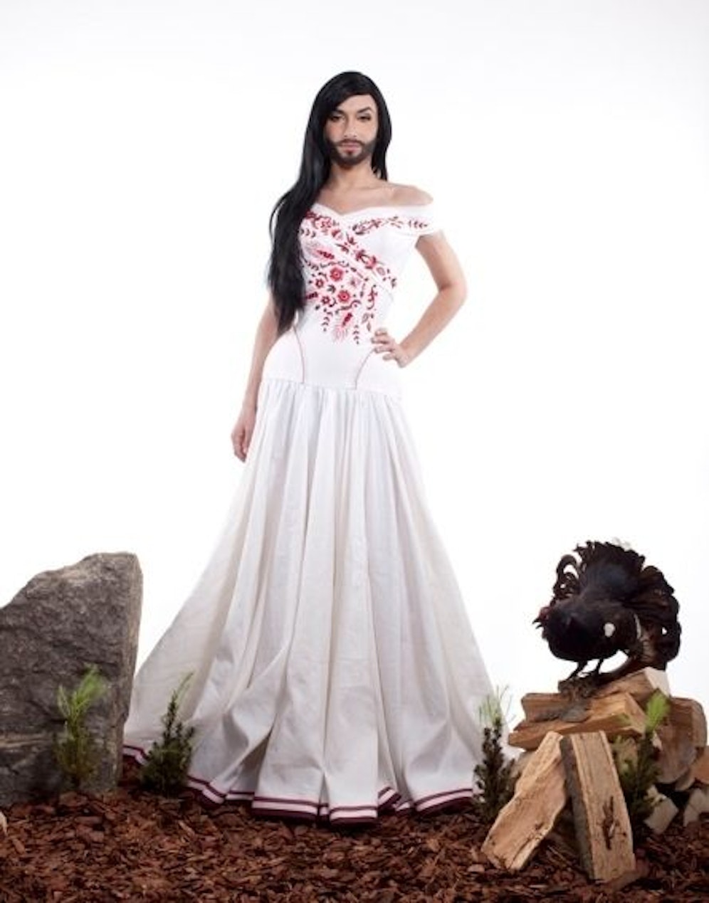 Die oft kopierte Stil-Ikone und Österreichs Geheimwaffe für den Song Contest 2012 in Baku, Conchita Wurst, trägt eine Robe von Tu felix Austria in blütenreinem Weiß mit österreichtypischer, weinroter Bestickung.