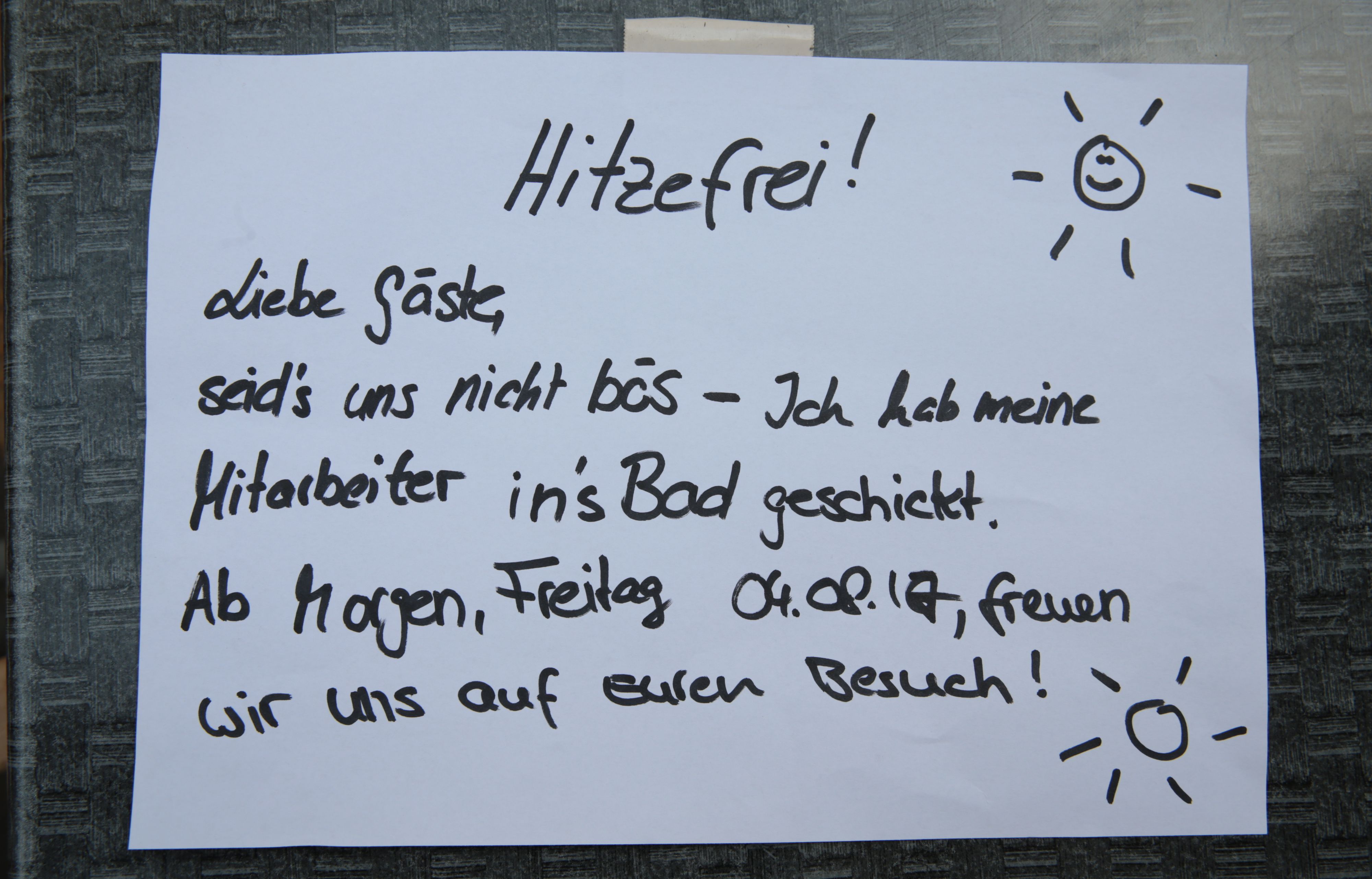 "Seid's uns nicht bös - ich hab meine Mitarbeiter ins Bad geschickt", vertröstete der Inhaber eines Lokals seine Gäste. "Ab Freitag freuen wir uns auf Euren Besuch."
