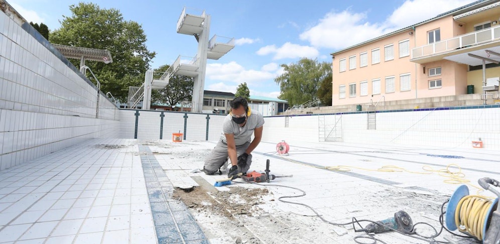 Mehrere Fliesenleger arbeiten daher derzeit im ausgelassenen Sportbecken. Jede einzelne rund 40 Jahre alte Fliese wird abgeklopft. Ist sie locker oder kaputt, wird sie herausgeschnitten und eine neue eingesetzt. Auch Spezialfugen kommen zum Einsatz, die Arbeiten sind aufwändig. Rund eine Woche wird das 50 Meter lange und 16 Meter breite Sportbecken, anschließend das 64 Meter lange und 16 Meter breite Wellenbecken saniert – natürlich unter Einhaltung der Schutzmaßnahmen: "Für mich ist das Tragen des Mundschutzes und einer Brille nicht so tragisch. Mir ist es wichtiger, mein Leben zu schützen", meint Fliesenleger-Meister Ali (37).