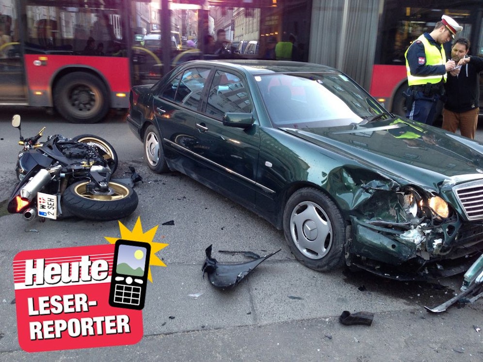 Verkehrsunfall in der Davidgasse im 10. Bezirk: Gleich zwei Leserreporter knipsten ein Bild der Unfallstelle, um den Crash für die Nachwelt festzuhalten. Der Pkw wurde an der Vorderseite von einem Motorrad touchiert. Der grüne Mercedes nahm eine Stopptafel offenbar nicht allzu erst, sodass der von rechts kommende Motorradfahrer keine Möglichkeit mehr hatte auszuweichen.