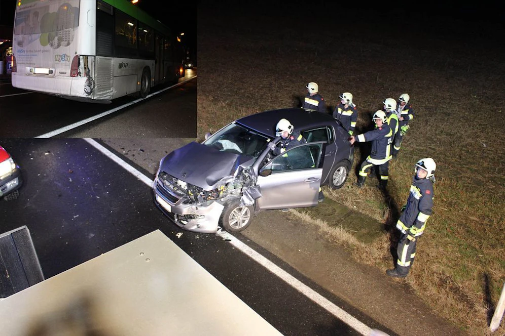 Spektakulärer Unfall Montagabend in Mannswörth (Wien-Umgebung): Auf einer Kreuzung krachten ein Pkw und ein Linienbus zusammen. Die Feuerwehr musste ausrücken, Verletzte gab es zum Glück nicht.