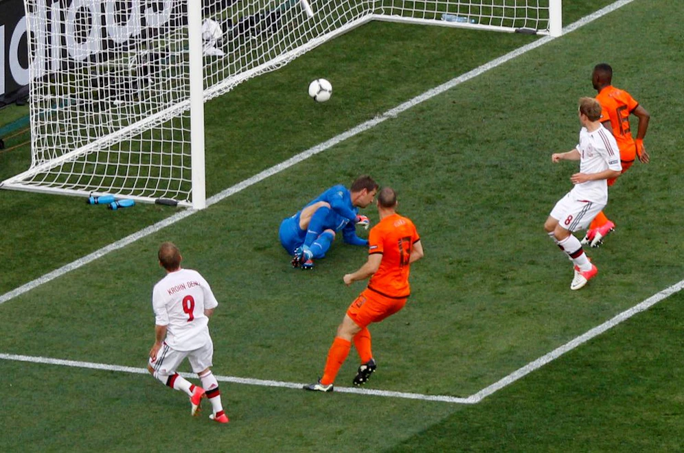 Danach stürmten die Niederländer unentwegt auf das dänische Tor. Doch der Ball wollte einfach nicht im Netz landen. Robben traf nach einem Fehler vom dänischen Torhüter Andersen nur die Stange (36.). Auch Afellay (39.) scheiterte. Der glücklose Van Persie vergab in der 44. Minute alleinstehend, als er sich einen Ball schlecht mitgenommen hatte. Mit dem 0:1 ging es in die Pause.