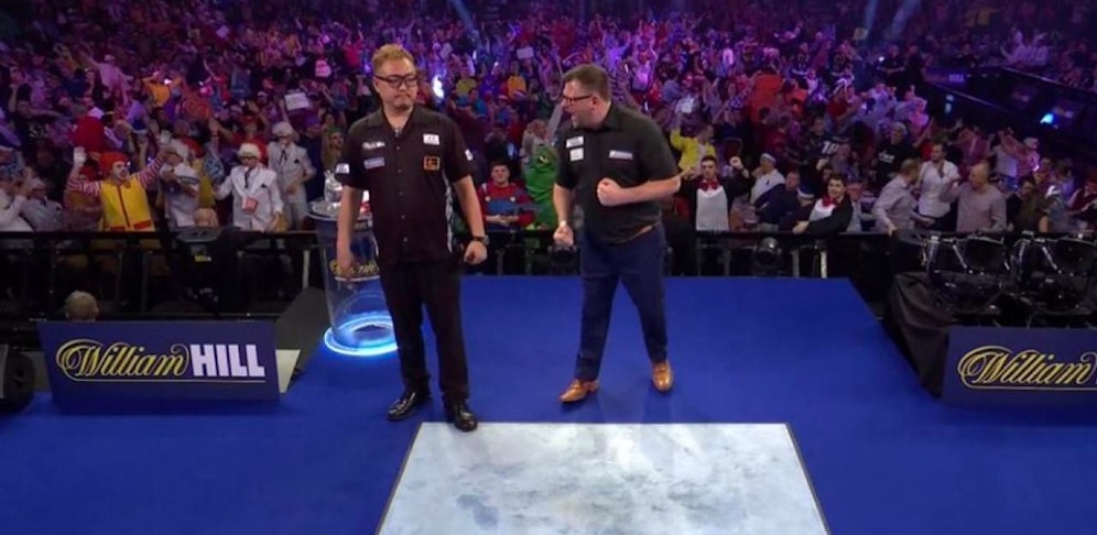Darts-Ass James Wade ist bei der WM im Londoner "Ally Pally" komplett ausgeratet. Während seines Zittersiegs gegen den Japaner Seigo Asada in der zweiten Runde brüllte der Engländer seinen Gegenspieler an. Die Einschüchterungstaktik wirkte offenbar, Wade gewann im heiß umkämpften fünften Satz.