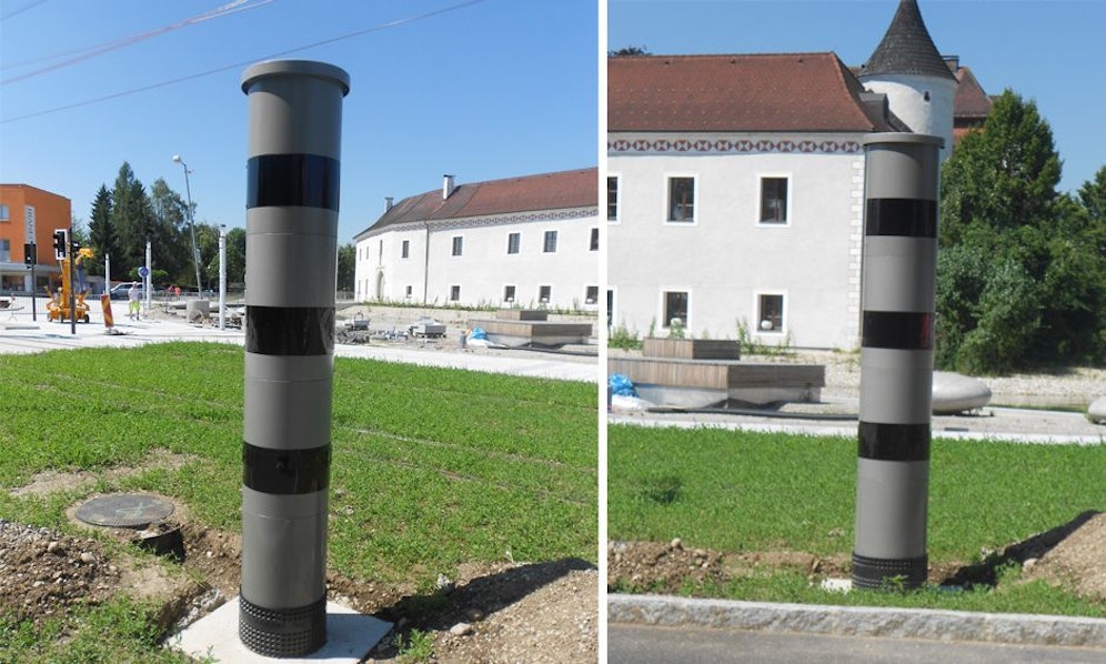 Wenn man den Pfosten sieht, könnte es teuer werden! Denn das ist kein Straßenbegrenzungspfosten oder Entlüftungsrohr oder dergleichen. Auch wenn man das vermuten könnte. In Wirklichkeit steckt ganz viel Technik drin. Gemeine Technik. Denn das ist eine Radarfalle.