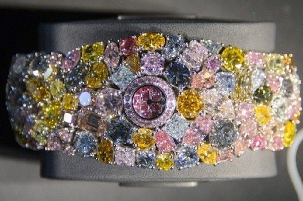 Alltagstauglich ist etwas anderes: Ein britischer Edeljuwelier hat eine Damen-Armbanduhr im Wert von umgerechnet 40 Millionen Euro vorgestellt. Das mit seltenen farbigen Diamanten besetzte Schmuckstück für das Handgelenk wurde auf der internationalen Uhrenmesse Baselworld präsentiert.