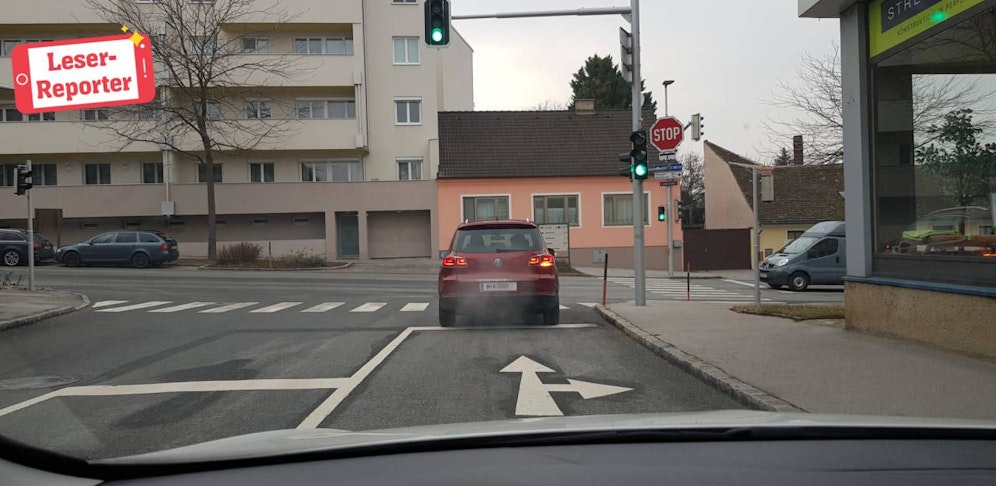 "Heute"-Leserreporter Dominik machte am Sonntagnachmittag eine kuriose Entdeckung. Als er in Wolkersdorf (NÖ) an einer Kreuzung stand, gab es genau zwei Fahrstreifen, auf denen er sich positionieren konnte. Einer davon ging nach links, der andere nach rechts, aber einer zeigte auch geradeaus. Problem dabei: Geradeaus ist gar keine Straße, sondern es steht dort ein kleines Haus.