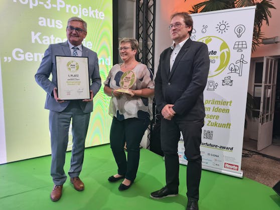 Ollersdorf im Burgenland setzt auf regional produzierte erneuerbare Energie. Durch fünf Bürgerbeteiligungsmodelle entstanden mehr als 50 Photovoltaik-Anlagen auf öffentlichen Gebäuden, Unternehmen, Vereinsgebäuden und privaten Gebäuden. Auch die Wallfahrtskirche wird mit Photovoltaik-Strom versorgt. Der Preis wurde von Gemeindebundpräsident Ing. Mag. Alfred Riedl überreicht. Weitere Infos