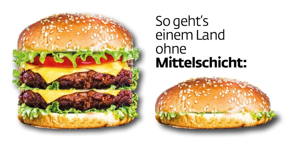 Mittelschicht gegen Mittelstand, das ist Brutalität. Während die ÖVP seit Jahrzehnten um den Mittelstand buhlt, umwirbt die SPÖ ab morgen die Mittelschicht. Mit deftigen Sujets soll die Partei der Mehrheit der Österreicher (85 % zählen sich selbst zur Mittelschicht, 60 % sind laut Wirtschaftsforschern Mittelstand, Anm.) schmackhaft gemacht werden.