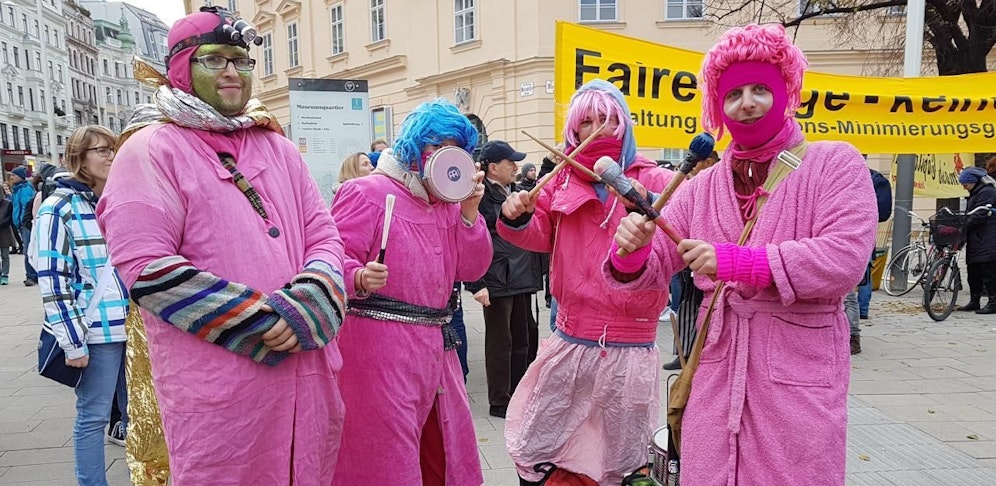 Die Demonstranten versammelten sich ab 13 Uhr am Platz der Menschenrechte vor dem Museumsquartier und machten bereits dort lautstark mit Trommeln auf sich aufmerksam. Mit der Kundgebung "Klima schützen – Leben retten" wollten die Veranstalter dabei ganz bewusst ein Zeichen für den Klimaschutz sein. So forderten die Teilnehmer unter anderem "Faire Flüge - Keine Lüge" und den "Stopp der 3. Piste" auf dem Flughafen Schwechat.