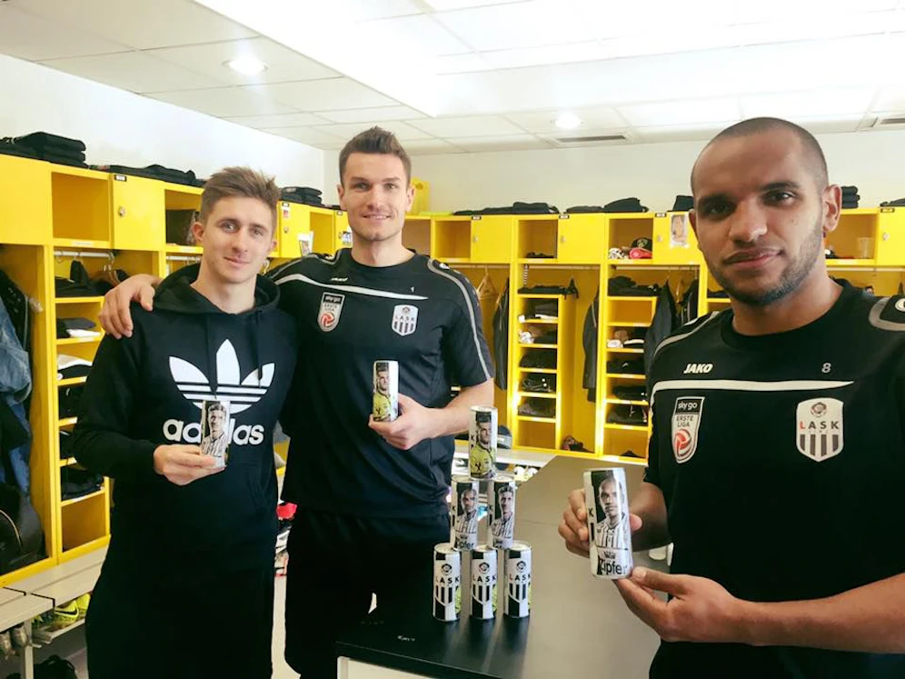 Gleich nach dem Duell mit Blau Weiß können die LASK-Fans bei einem Sieg gleich mit ihren Lieblingen anstoßen. Eine Dose kostet 2,99 Euro. Wird das komplette Set (24 Spieler plus Trainer Oliver Glasner) gekauft, gibt es die einzelne Dose für 2,49 Euro.