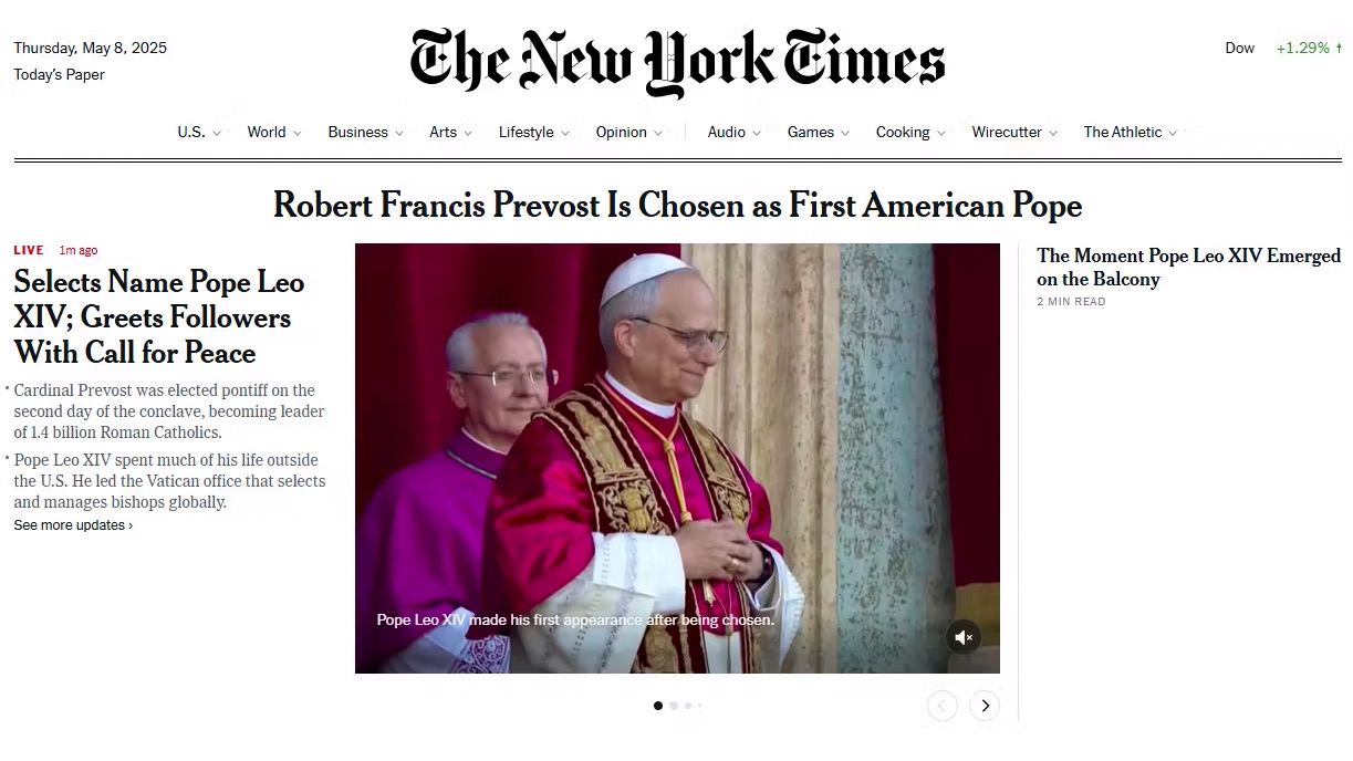 Die "New York Times" hat sich für die nüchterne Headline "Robert Francis Prevost Is Chosen as First American Pope" entschieden (Robert Francis Prevost wird als erster amerikanischer Papst gewählt). Die Zeitung analysiert: "Die Wahl des ersten amerikanischen Papstes fällt in eine Zeit, in der sich rund 20 Prozent der erwachsenen US-Amerikaner als katholisch bezeichnen – ein Anteil, der seit etwa einem Jahrzehnt stabil ist. In der Heimatstadt von Papst Leo XIV., Chicago, ist der katholische Bevölkerungsanteil sogar noch höher: In der Metropolregion Chicago ist laut dem Erzbistum Chicago etwa jeder Dritte katholisch."