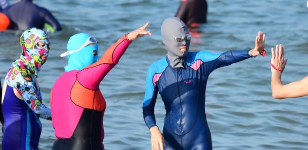 An Chinas Stränden tümmeln sich immer mehr Menschen, die optisch mehr mit Bankräubern als mit Strandnixen verbindet. Anders als der "Burkini" hat der sogenannte "Facekini", bei dem das gesamte Gesicht bis auf Augen und Mund verhüllt wird, keinen religiösen Hintergrund.