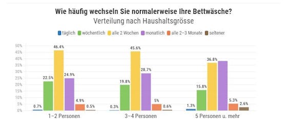 Auch die Haushaltsgröße ist laut der Galaxus-Befragung entscheidend für die Sauberkeit in unseren Betten: In größeren WGs und Familienhaushalten wechseln die Menschen ihre Bettwäsche seltener als in Single- und Zweipersonenhaushalten. "Das liegt wohl am Aufwand. Wer nur ein Bett frisch beziehen muss, macht das wahrscheinlich regelmäßiger als jemand, der sich gleichzeitig auch noch um die Betten der Familienmitglieder kümmert", heißt es dazu.