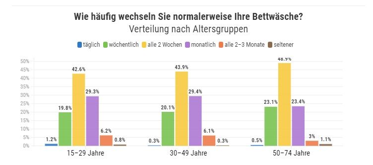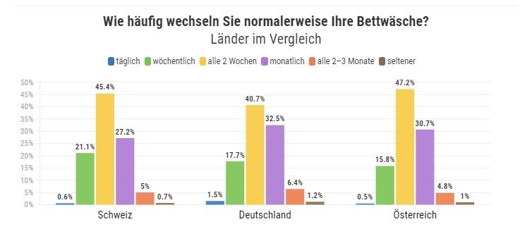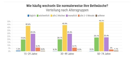 Auch bei der Bettwäsche haben wir einiges an Hygiene-Nachholbedarf. Laut Empfehlung sollten wir unsere Betten alle zwei Wochen frisch beziehen. Ein Drittel der Befragten gab an, dass sie ihre Bettwäsche seltener wechseln – dabei sind die Schweizer im Ländervergleich sogar noch am saubersten, die Österreicher im Mittelfeld und die Deutschen das Schlusslicht. Mit dem Alter scheinen die Menschen immer hygienischer zu werden, denn am häufigsten wechseln die Bettwäsche Menschen von 50 bis 74 Jahren.