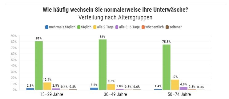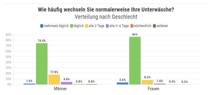 Auf den ersten Blick sehen die Resultate der Befragung von 1.000 Personen ziemlich hygienisch aus: 83 Prozent aller Befragten wechseln ihre Unterwäsche wie empfohlen täglich. Die Männer ziehen diesen Schnitt allerdings runter: Fast ein Viertel der Männer im Alter von 14 bis 74 Jahren wechselt die Unterwäsche seltener und läuft somit regelmäßig in schmutzigen Unterhosen herum. Bei den Frauen ist es nur jede Zehnte.