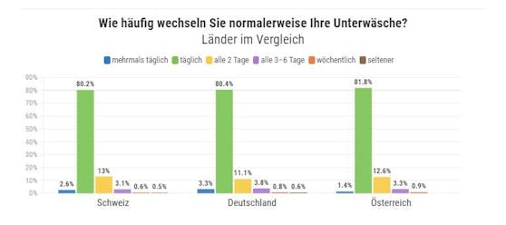 Die Schweiz führt das Schmutzig-Unterhosen-Ranking der deutschsprachigen Länder an: 17,2 Prozent der Menschen wechseln hier ihre Unterhosen nicht jeden Tag. In Deutschland sind es 16,3 Prozent, in Österreich 16,8. Nach Altersgruppen tragen die 50- bis 74-Jährigen in Österreich am häufigsten schmutzige Unterhosen, gefolgt von den 15- bis 29-Jährigen. Viele Unterwäsche-Goblins finden sich zudem unter den Personen mit geringer Schulbildung. Mit zunehmender Bildung nimmt auch die Hygiene bei den Slips und Boxershorts zu. Irritierend: Jeder hundertste Österreicher (0,9 Prozent) gibt gar an, seine Unterwäsche nur wöchentlich zu wechseln.