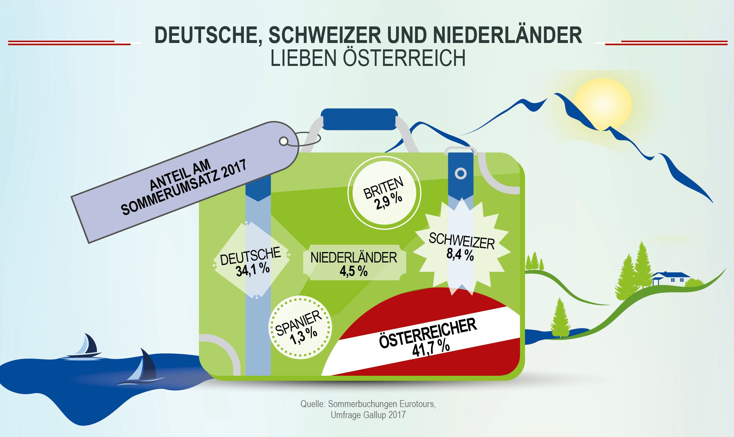 Die beliebtesten Urlaubsregionen liegen in Salzburg (26,9 % der Eurotours-Kunden), Tirol (18,3) und der Steiermark (17,1). Für einen einwöchigen Sommerurlaub in Österreich geben die Österreicher 500 bis 650 € aus (Hotel, Anreise, Nebenkosten), internationale Gäste 650 bis 1.250 € im selben Zeitraum.