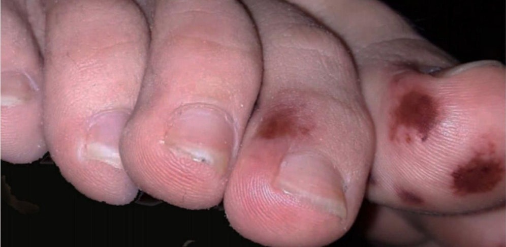 Die Flecken treten meistens an den Zehen auf, gelegentlich aber auch an den Fingern. Gerade wurde ein Fallbericht eines 13-jährigen italienischen Jungen auf der Seite des Internationalen Verbandes der Podologen publiziert. Darin wird nach Dokumentation des behandelnden Kinderarztes beschrieben, dass bereits zwei Tage vor den ersten typischen Symptomen auffällige violette Verfärbungen an den Füßen auftraten. Diese Beschreibung ist kein Einzelfall. Die geschilderten Hautirritationen würden teilweise Masern, Windpocken oder Frostbeulen ähneln.