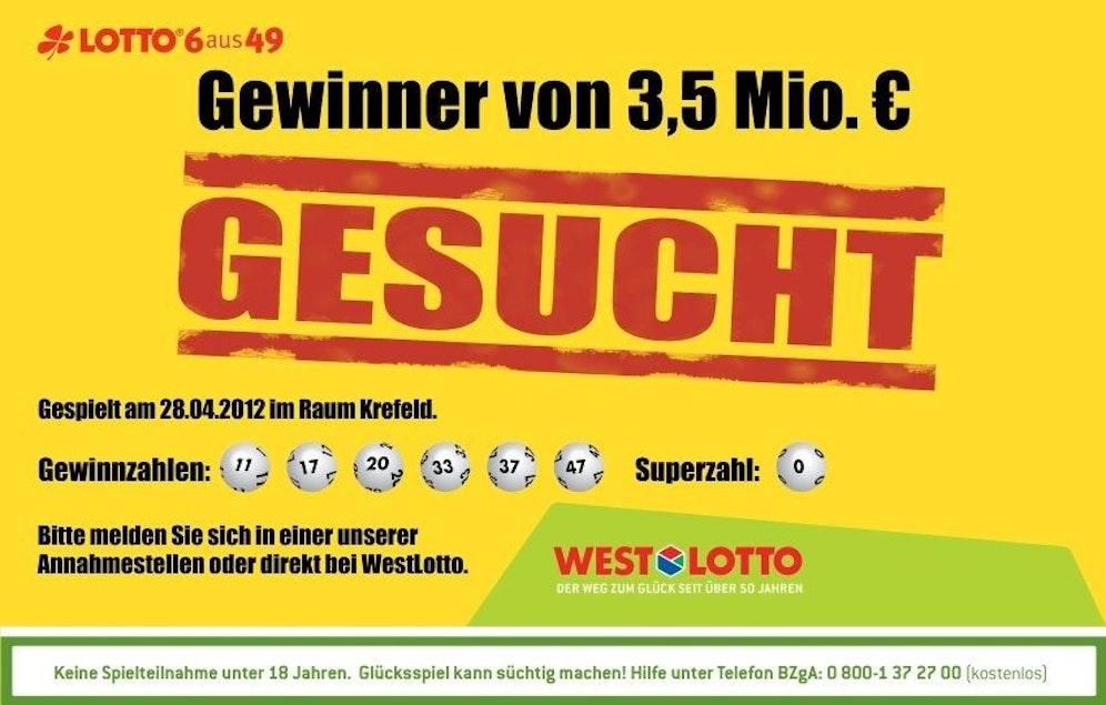 Vor zwei Jahren hatte Westlotto schon einmal mit Suchpostern nach einem Millionär gefahndet. Damals hatte ein Teilnehmer 8,4 Millionen Euro abgeräumt, war aber erst durch die Aktion auf seinen Gewinn aufmerksam geworden.