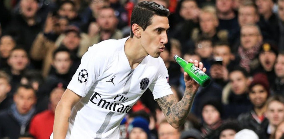 Für Angel di Maria wurde die Rückkehr zu seinem Ex-Verein Manchester United zur großen Party. Der Argentinier legte beim 2:0-Sieg von PSG beide Tore mustergültig auf, dann gönnte er sich einen kleinen Schluck Bier während des Spiels.
