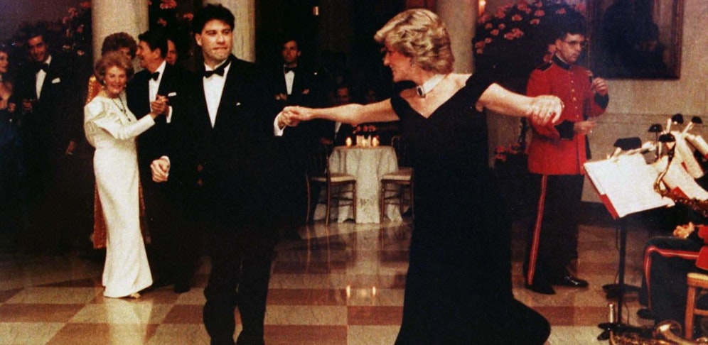 Bei einem Staatsbesuch 1985 im Weißen Haus trug Prinzessin Diana ein tiefblaues Samtkleid. Berühmt wurde es, als die verstorbene Princess of Wales mit Schauspieler John Travolta damit über das Tanzparketts schwebte.