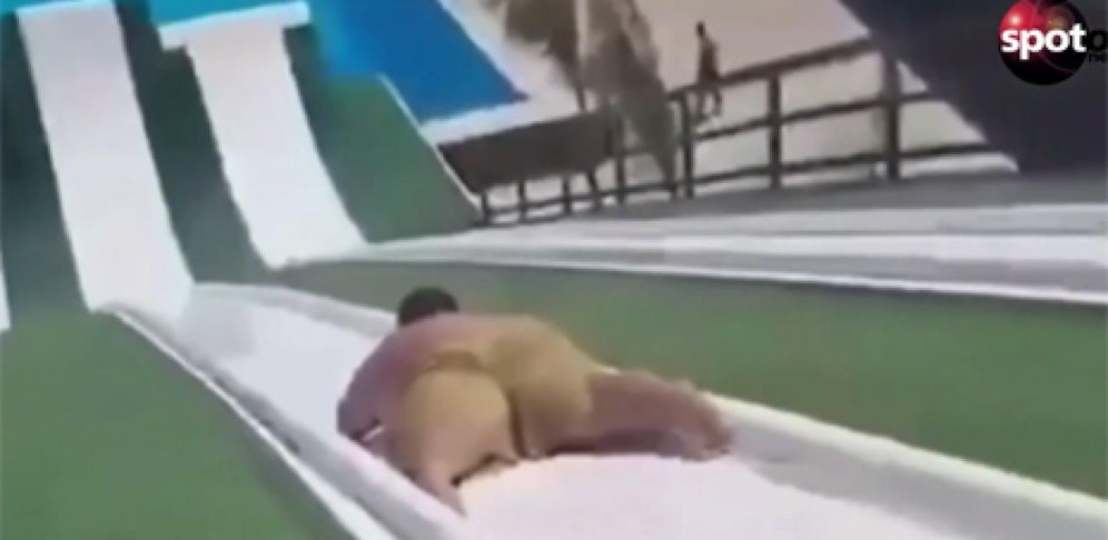 Schließlich fasst der füllige Mexikaner all seinen Mut und rutscht los.