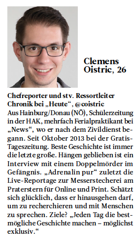 Besonders erfreulich für "Heute" und heute.at: Unter den Ausgezeichneten ist dieses Mal auch ein Redakteur von Österreichs erfolgreichster Gratis-Tageszeitung: Clemens Oistric, 26, wurde unter anderem für seine Live-Reportage vom Messerattentat am Wiener Praterstern ausgezeichnet. Oistric arbeitet seit 2013 für "Heute", ist Chefreporter in unserem Chronik-Ressort und Stellvertreter von Chronik-Chef Markus Hofer. Das Branchenmagazin befragte Oistric nach seinen beruflichen Zielen. Antwort: "Jeden Tag die bestmögliche Geschichte machen – möglichst exklusiv."