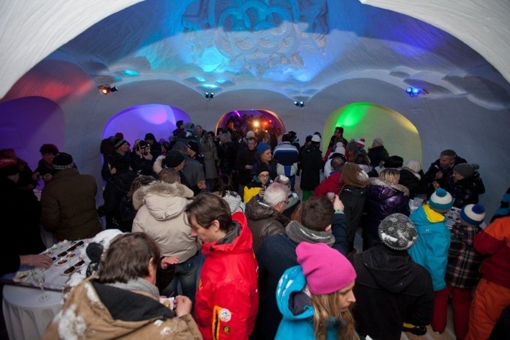 Dutzende Arbeiter schufen aus 5000 Tonnen Schnee einen 200 Quadratmeter großen Tanzpalast in 2000 Meter Höhe. Durch einen kleinen Eingang geht es auf die große Tanzfläche und von dort weiter in die exklusive Eisbar – kühle Getränke sind garantiert!