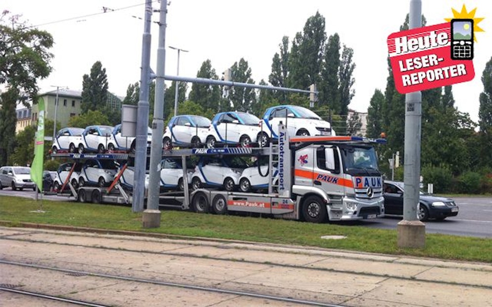 Hier werden gerade Zwölflinge geliefert, die bald durch Wien toben werden. Die Car2Go-Winzlinge sind noch im Dornröschenschlaf, bald jedoch werden sie durch die Straßen wuseln.