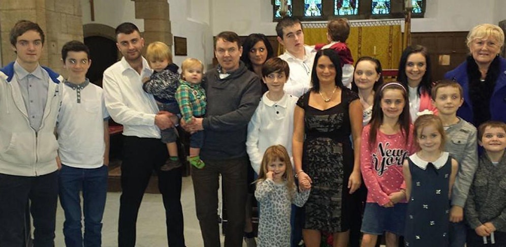 Sue Radford bekam ihr erstes Kind – Sohn Chris, heute 27 Jahre alt – mit 14. Weil sie und ihr Schulschatz Noel in Adoptivfamilien aufgewachsen waren, kam eine Abtreibung für die beiden gar nicht infrage. Fünf Jahre später folgte Tochter Sophie (22). Dann kamen Chloe (21), Jack (19), Daniel (17), Luke (15), Millie (14), Katie (13), James (12), Ellie (11), Aimee (10), Josh (9), Max (7), Tillie (6), Oscar (4), Casper (3), Hallie (2) und zuletzt Phoebe im vergangenen Sommer. Zwischen Casper und Hallie, im Juli 2014, kam Sohn Alfie als Frühchen zur Welt. Er überlebte aber nicht.
