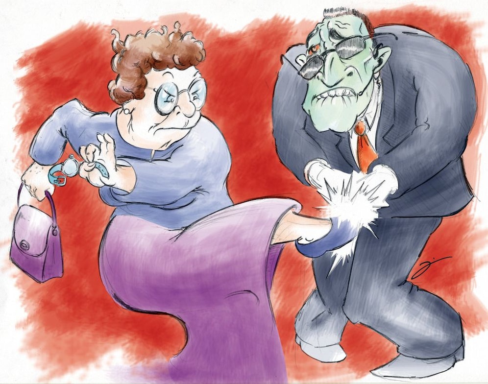 Nachdem der Mann der schon etwas älteren Dame höflich auf die Beine geholfen hatte, versetzte ihm die 61-Jährige einen kräftigen Tritt mit der Stiefelspitze und erwischte ihn in den männlichen Weichteilen. Die Frau, die eine Uhr an der Kassa vorbei geschmuggelt hatte, wurde nach Angaben der Polizei vom Mittwoch wegen räuberischen Diebstahls angezeigt.