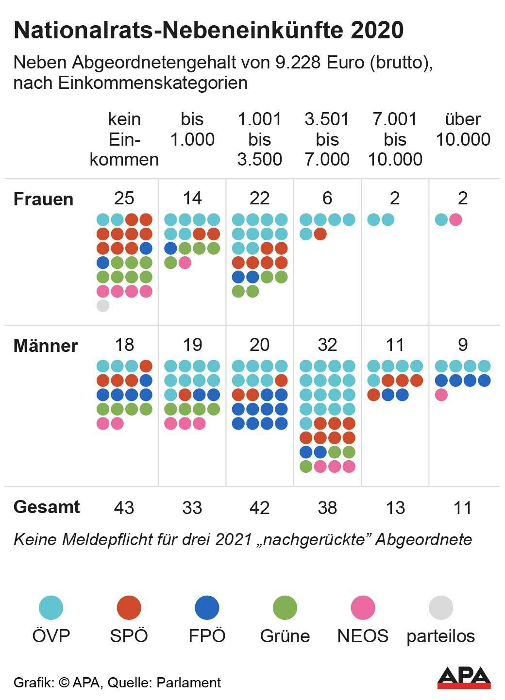 In die Einkommenskategorie über 7.000 Euro brutto fallen unter anderen die Parteimanager Alexander Melchior (ÖVP) und Michael Schnedlitz (FPÖ) sowie bei der SPÖ die – allesamt männlichen – Spitzengewerkschafter Rainer Wimmer, Josef Muchitsch, Alois Stöger und Rudolf Silvan. Drei erst 2021 nachgerückte Abgeordnete mussten für das Vorjahr noch keine Einkommenskategorie melden.