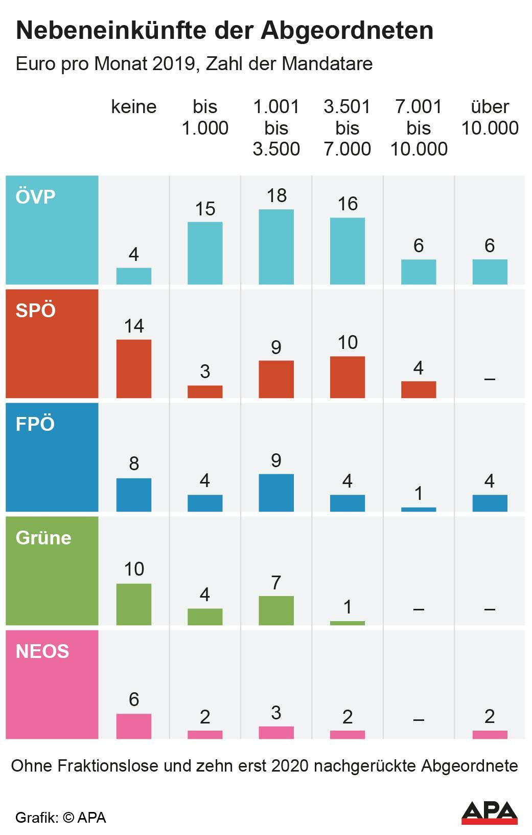 Dass ein Abgeordneter wirklich keinerlei Nebentätigkeiten ausübt, ist eine Seltenheit. Denn zumindest leitende ehrenamtliche Funktionen übernehmen praktisch alle. Hier ist der Frauenanteil mit 58 Prozent ausgewiesen hoch. Zu diesen 43 hauptberuflichen Mandataren gehören allerdings auch die Klubobleute der fünf Parlamentsparteien sowie die drei Nationalratspräsidenten, die deutlich mehr verdienen als normale Abgeordnete, dafür aber mit einem Berufsverbot belegt sind. Auch Regierungsmitgliedern sind Nebenjobs untersagt.