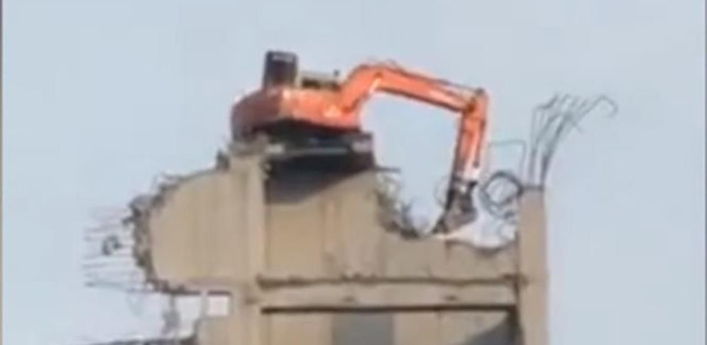 Dieser Baggerfahrer hat Nerven aus Stahl. Beim Abriss eines Hauses steht sein Gefährt zuoberst auf der Bauruine. Kontinuierlich arbeitet er sich dem Boden entgegen. Fehler darf man sich bei dieser Methode jedenfalls nicht erlauben.