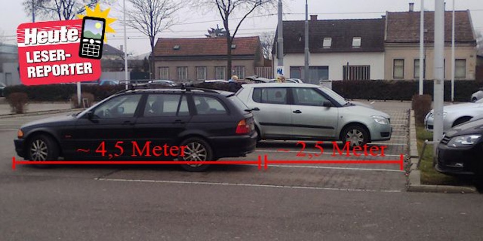 Hier parkte eine Frau ihren BMW-Kombi im 21. Bezirk in der Donaufelder Strasse. "Der ist aber lang", muss sie sich gedacht haben und legte deshalb Wert auf Sicherheitsabstand. Sich aber quer über zwei Parkplätze zu stellen und auch noch die Zufahrt zu den anderen Stellplätzen zu sperren, ist eine Glanzleistung.