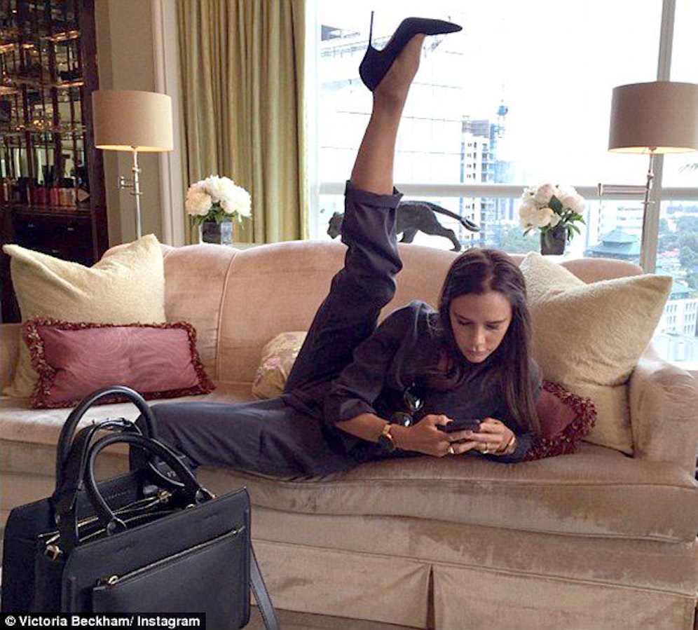 Victorias Secret: Zeitmanagement ist alles. Ihre YogaÜbungen macht Frau Beckham auf der Couch - in High Heels, während sie Mails am Handy checkt. https://instagram.com/victoriabeckham/