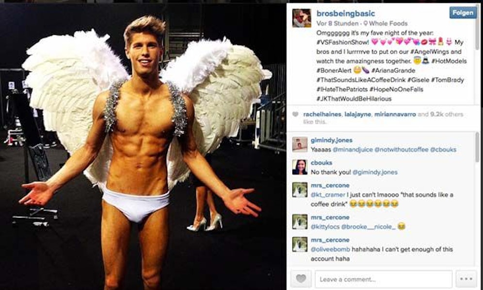 Herrlich. Männer stellen typische und außergewöhnliche Frauen-Posen nach – hier als Victoria’s- Secret-Engel. instagram.com/brosbeingbasic.